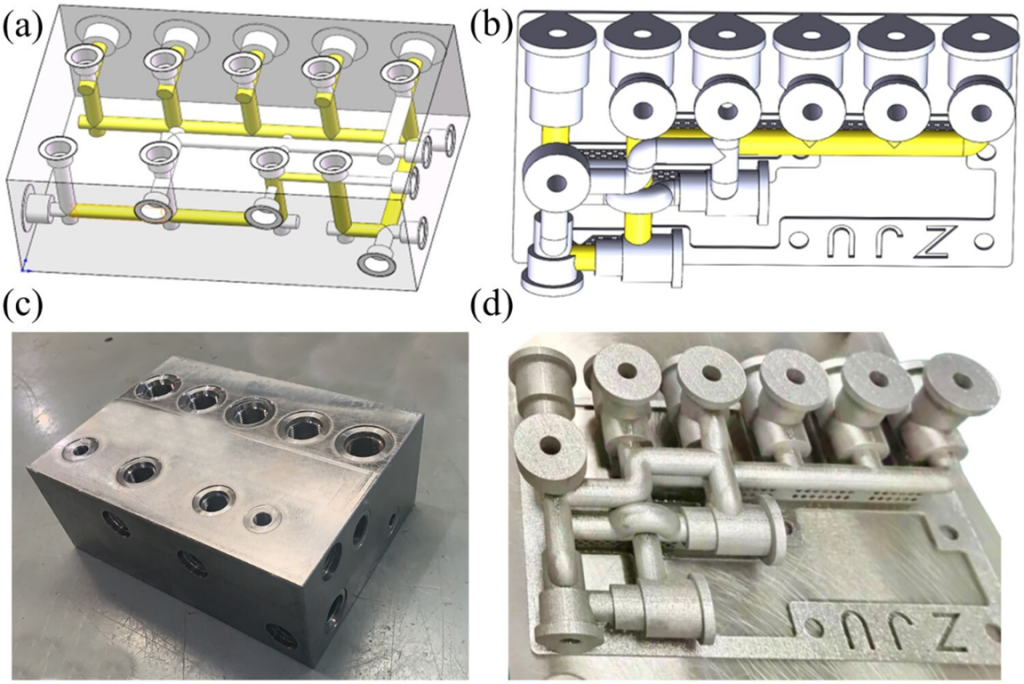 В качестве примера упомянем результаты редизайна традиционного гидравлического коллектора с использованием алгоритма многокритериальной оптимизации для технологии SLM, описанные в журнале Virtual and Physical Prototyping. Оригинальный коллектор весил 5 кг при объеме 640 см³. Оптимизированная для аддитивного производств версия c оптимальными каналами показала снижение потерь давления на 40-60%, а за счёт оптимизации формы его масса снизилась на 80% до 1 кг при объеме 136,23 см³. На фотографии слева — оригинальный коллектор; справа — коллектор, изготовленный с помощью технологии SLM |