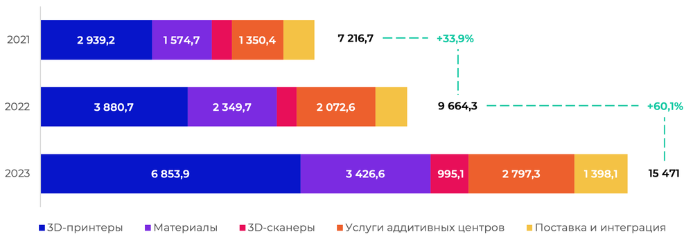 Событие, произошедшее весной 2024 года, можно назвать эпохальным для отечественной аддитивки. Клуб аддитивных технологий представил результаты проведенного им масштабного комплексного исследования российского рынка технологий аддитивного производства. Аналитике подверглись 3D-принтеры, 3D-сканеры, материалы, а также центры 3D-печати. По оценке экспертов, за 2022–2023 годы рынок вырос на 60,1% и составил 15,5 млрд руб.