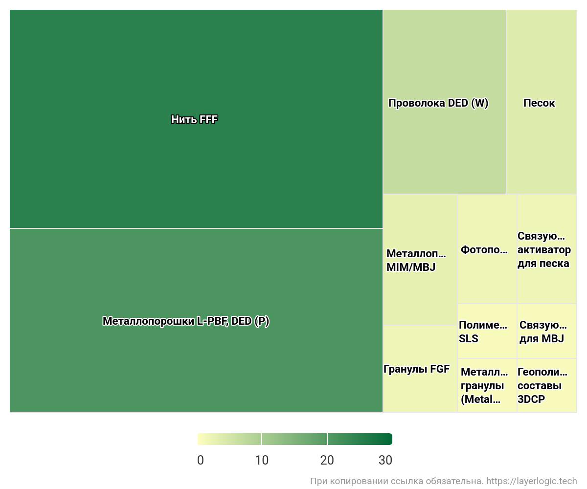 Наиболее широко представлены производители экструзионных 3D-принтеров по технологии FFF (англ. fused filament fabrication) по полимерам и композитам (у нас представлено около 37 компаний) – сегмент, который и в мире очень бурно развивается благодаря своей относительной простоте и доступности. Второе место можно смело отдать порошковой технологии L-PBF/SLM (11 компаний), как самой премиальной (на данный момент) по работе с металлами и сплавами. Далее идет шнековая экструзия гранулированных материалов FGF (англ. fused granular fabrication), металлопорошковая наплавка L-DED (P) (англ. laser powder direct energy deposition), экструзия строительных смесей 3DCP (англ. 3D concrete printing), печать связующим BJ (англ. binder jetting), и другие. Нет у нас «свежих» инновационно направленных компаний в области Area Printing, MultiJet Printing, аналогов листовой ламинации, очень мало проволочной наплавки, электроннолучевой наплавки и плавления, фотополимеризации в ванне…