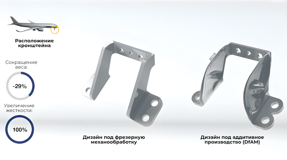В отличие от Spirit Aerosystems, Liebherr смогла вмешаться в конструкцию и оптимизировать деталь, что привело к снижению ее веса на 29%. Использование 3D-печати также помогло увеличить жесткость на 100%.