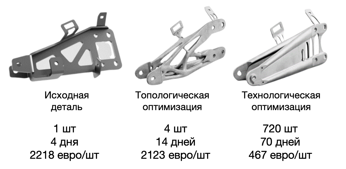 Следствием оптимизации традиционно выпускаемых деталей является более изящная бионическая форма, но вместе с этим прочная и долговечная. Уменьшение веса приводит к снижению расхода материала и, в некоторых случаях, может повысить производительность системы, в которой используется кронштейн.